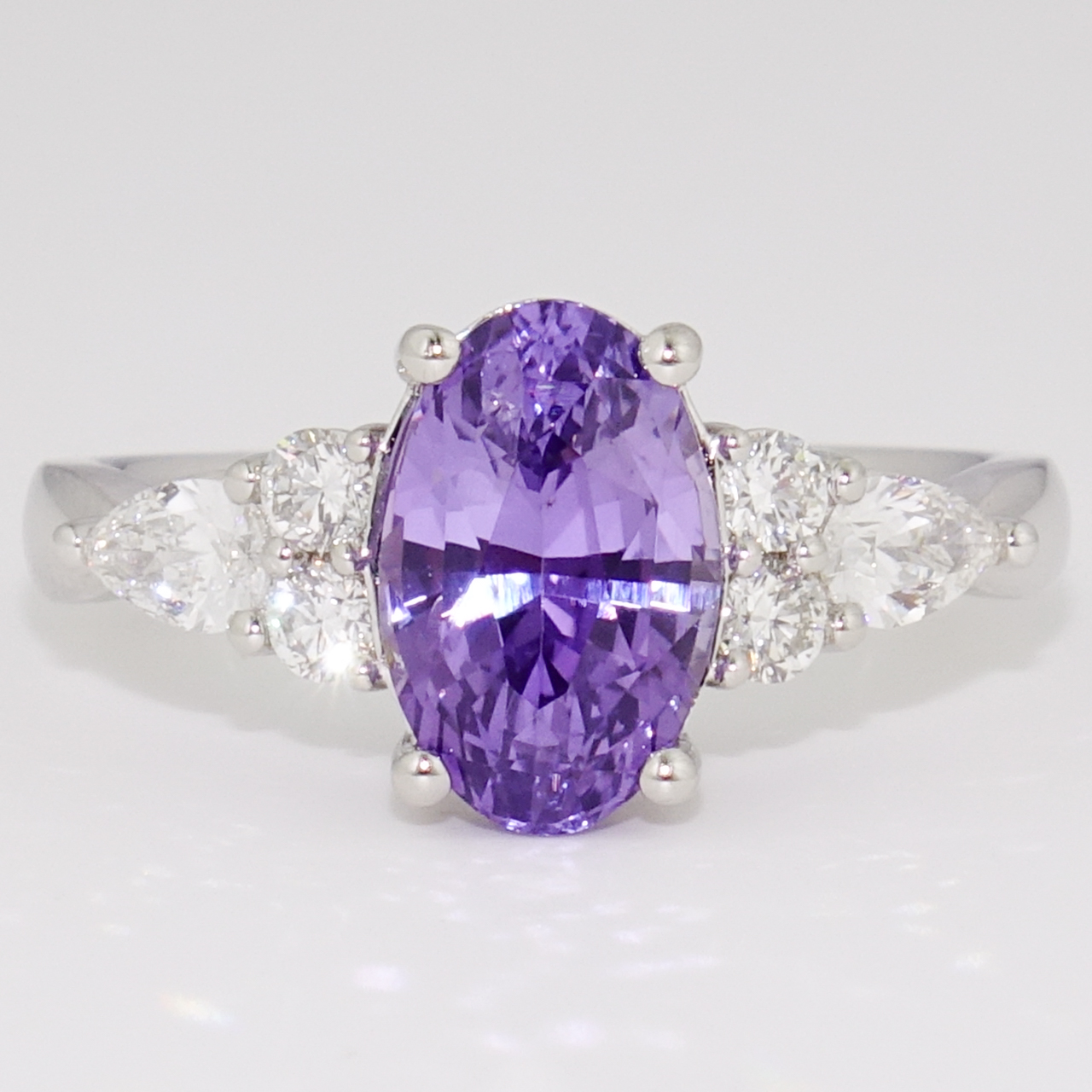 We've set this unheated oval cut purple sapphire, which was found in Sri Lanka, with two round brilliant cut diamonds and a pear cut diamond on each side in this fabulous ring.